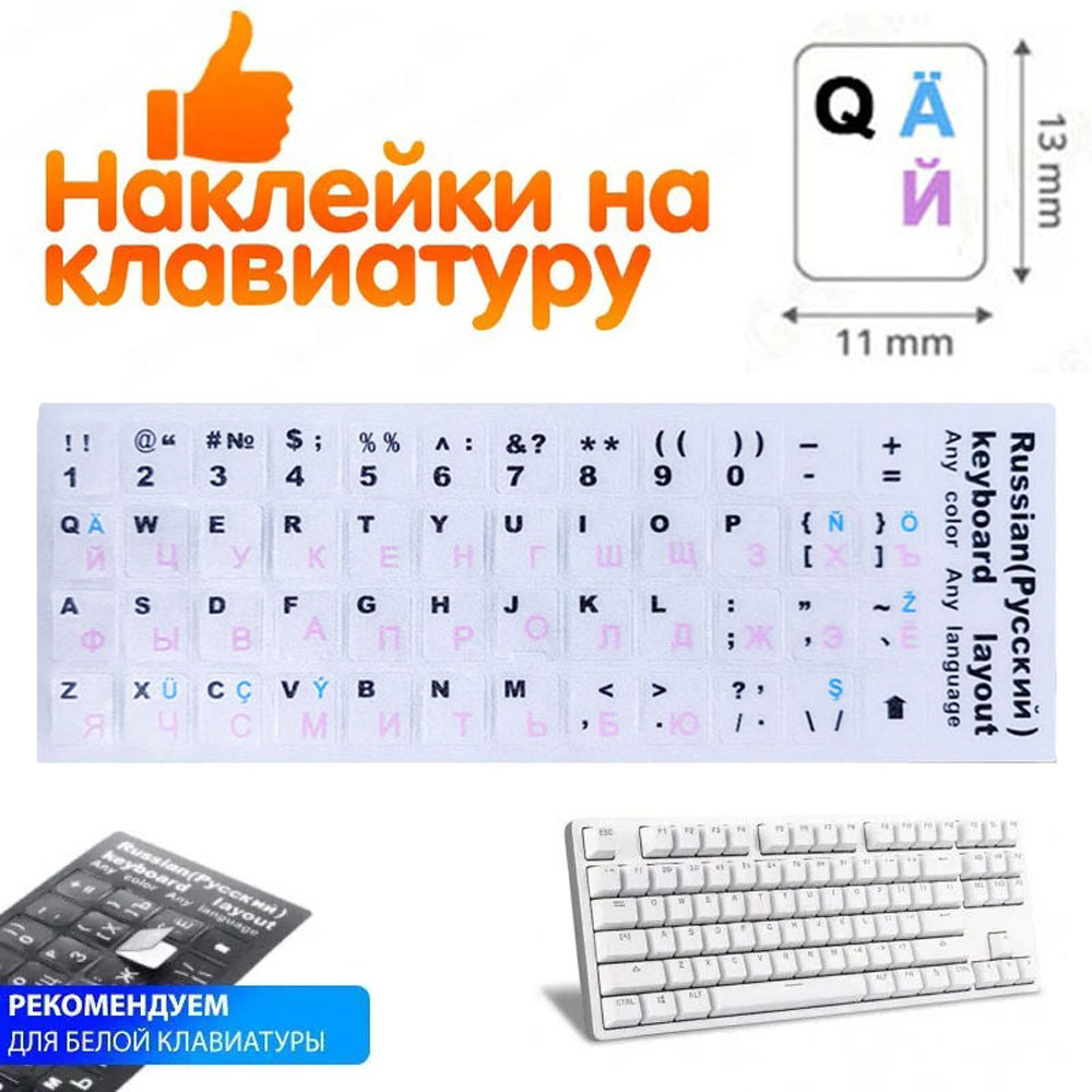 - Наклейки на клавиатуру прозрачные (Белый цвет / Раскладка Rus,Eng,Tm)