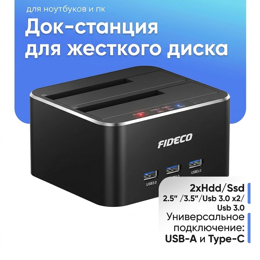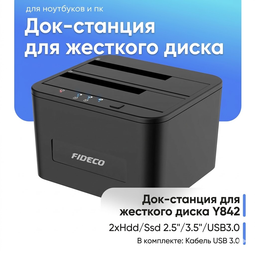 Док-станция для жесткого диска Fideco Y842H 2xHdd/ Ssd 2.5" /3.5"/Usb 3.0 x2/ Usb 3.0