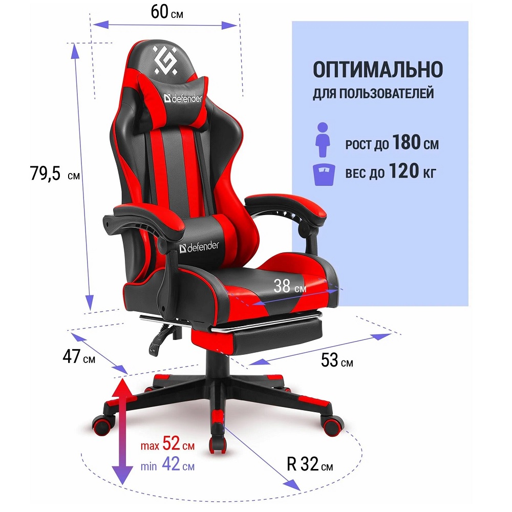 Полноразмерные подлокотники, регулировка высоты сидения, поддержка поясницы, подставка для ног