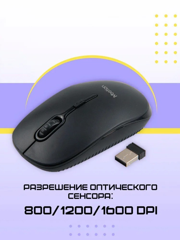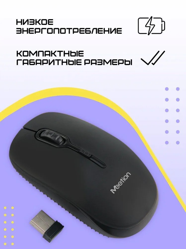 Беспроводная мышь MEETION Wireless Mouse 2.4G MT-R547 - это простая и удобная мышь, она позволяет эффективно работать и подходит как для правой, так и для левой руки. Благодаря точному оптическому датчику с возможностью переключения разрешения 800/1200/1600dpi данная модель мыши позволяет точно контролировать курсор при просмотре документов и веб-страниц. Беспроводная мышь работает на частоте 2,4 ГГц и имеет дальний радиус действия - до 10 м. Микроприемник во время переноски можно оставлять прямо в ноутбуке.