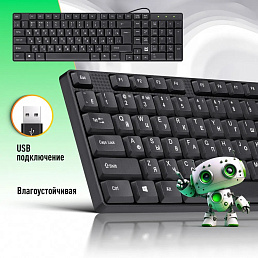 Оснащена классической печатной раскладкой, влагоустойчивым корпусом, а также надежным мембранным механизмом клавиш.